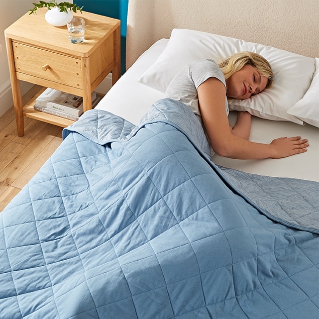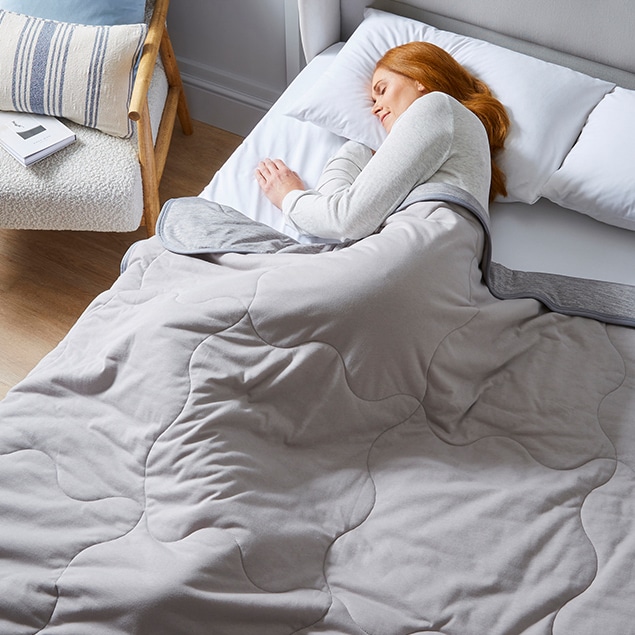 Rather than ditching all covers (which can feel vulnerable and uncomfortable), using a cooling blanket for summer gives you just enough weight without the heat. This makes it easier for your body to regulate its core temperature which will help you cool down for better sleep.