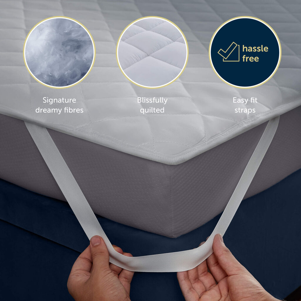 The blissfully soft quilted cover is filled with signature Dreamland fibres that offer luxurious comfort for the sleep of your dreams. Features stretchy elastic straps which fit all mattress depths.
