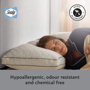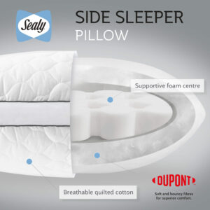 The Sealy Side Sleeper Pillows combine long-standing craftsmanship with the latest innovations. The deeply supportive foam centre helps to encourage the neck and spine to remain in a straight and neutral position for ultimate comfort and posture support while you sleep. The foam comfort layer is ventilated to encourage air to move around the pillow to keep you fresh and comfortable. DuPont™ fibres surround the foam centre and offer soft and bouncy superior comfort. The Side Sleeper pillows are hypoallergenic, odour-resistant and do not go through any harsh chemical treatments.