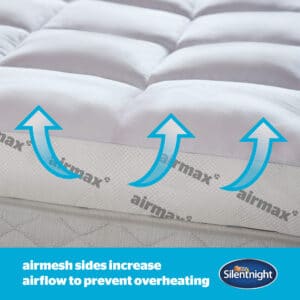 The Silentnight Airmax 1000 Mattress Topper will transform your existing mattress, providing unparalleled breathability for a comfortably refreshing night’s sleep. Specially designed to increase airflow, the Airmax 1000 topper features dual construction which allows air to move freely in-between the layers. The air mesh sides help this air to move freely around your body to keep you comfortable in every season. Deeply filled with hollowfibre, the extra deep 10cm dual layer construction also provides ultimate comfort and will help to refresh and rejuvenate any mattress.