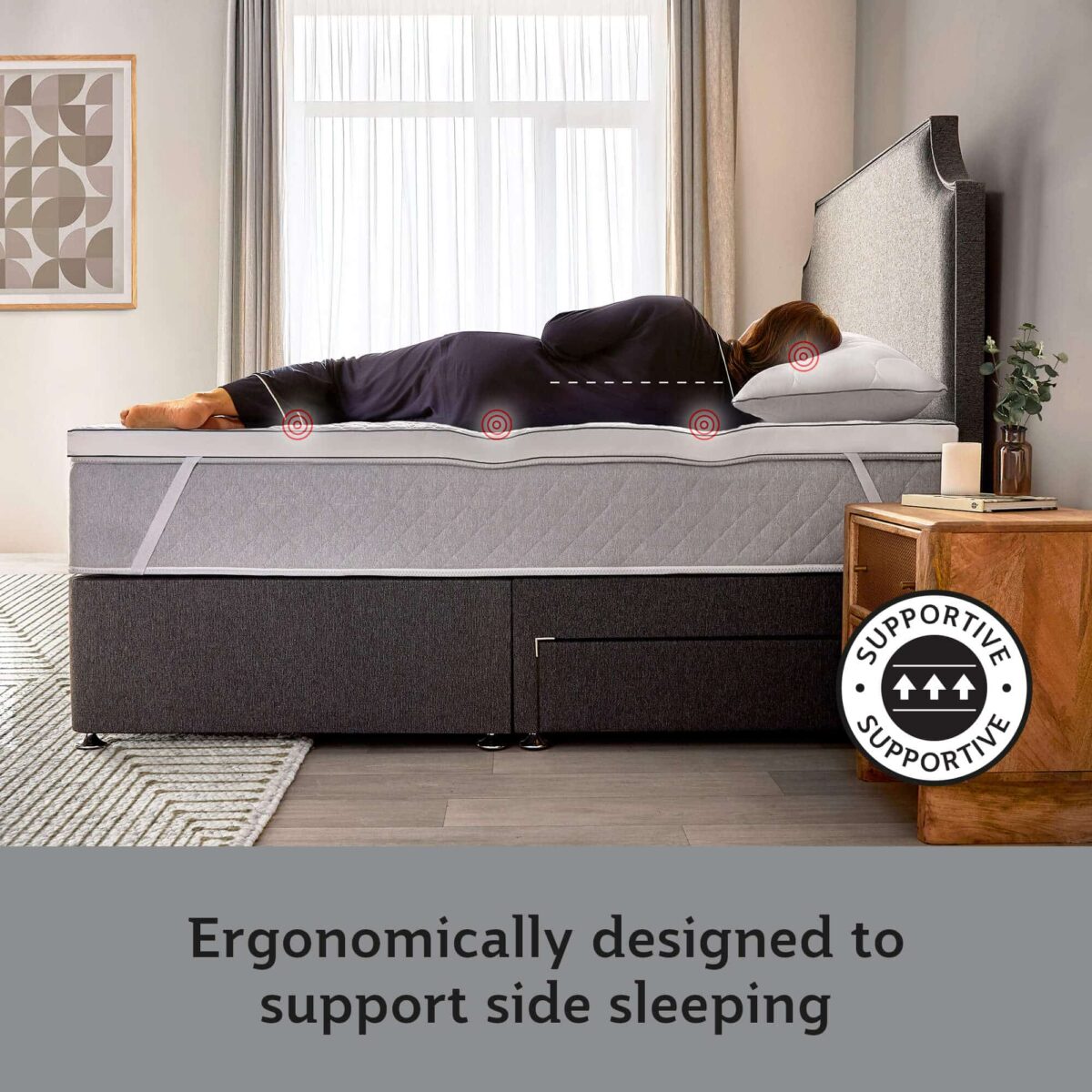 The Sealy Side Sleeper Topper is ergonomically designed to support side sleeping by evenly distributing weight for optimal body and spinal alignment.