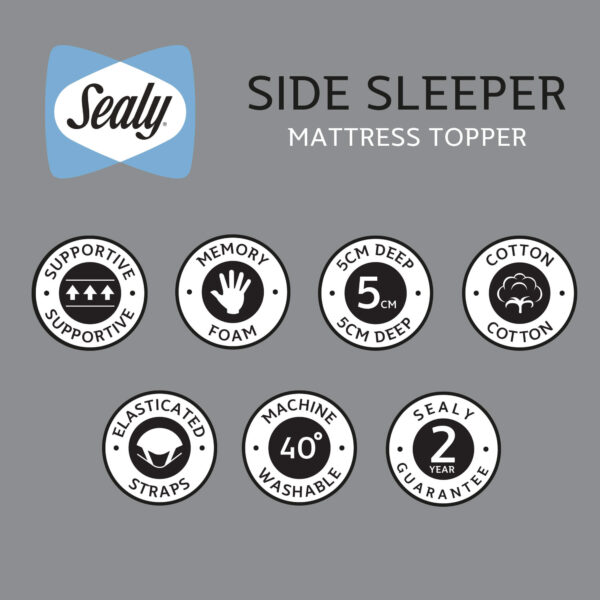 The Sealy Side Sleeper Topper is ergonomically designed to support side sleeping by evenly distributing weight for optimal body and spinal alignment.  Adds an additional 5cm of comfort to your mattress with a sink-in memory foam top.