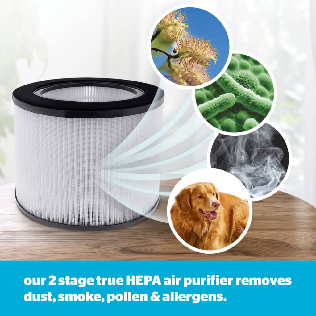 - 2 STAGE HEPA FILTER AIR PURIFIER – The purifier's filtering process includes a pre-filter for the largest particles, a HEPA filter to catch 99.9% of smaller particles, remove dust, pollen and other airborne contaminants.