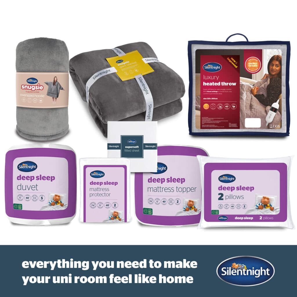 - SUPER COSY UNI BUNDLE: Everything you need in one super cosy bundle. Create your ultimate cosy uni bed with the Silentnight Deep Sleep Pillow and 13.5 Tog Duvet, Silentnight Deep Sleep Ultimate 500 Mattress Topper and Deep Sleep Mattress Protector, Silentnight Supersoft Fitted Sheet. Complete your super cosy comfort with the Silentnight Comfort Control Heated Throw, Snugsie Giant Blanket and Snugsie Overszied Hoodie.