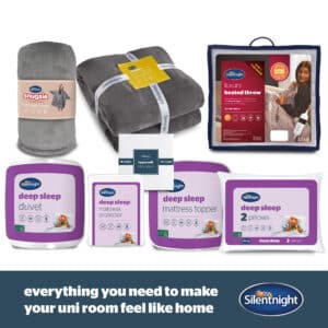 Everything you need for Uni in one super cosy bundle. Create your ultimate cosy uni bed with the Silentnight Deep Sleep Pillow and 13.5 Tog Duvet, Silentnight Deep Sleep Ultimate 500 Mattress Topper and Deep Sleep Mattress Protector, Silentnight Supersoft Fitted Sheet. Complete your super cosy comfort with the Silentnight Comfort Control Heated Throw, Snugsie Giant Blanket and Snugsie Overszied Hoodie.