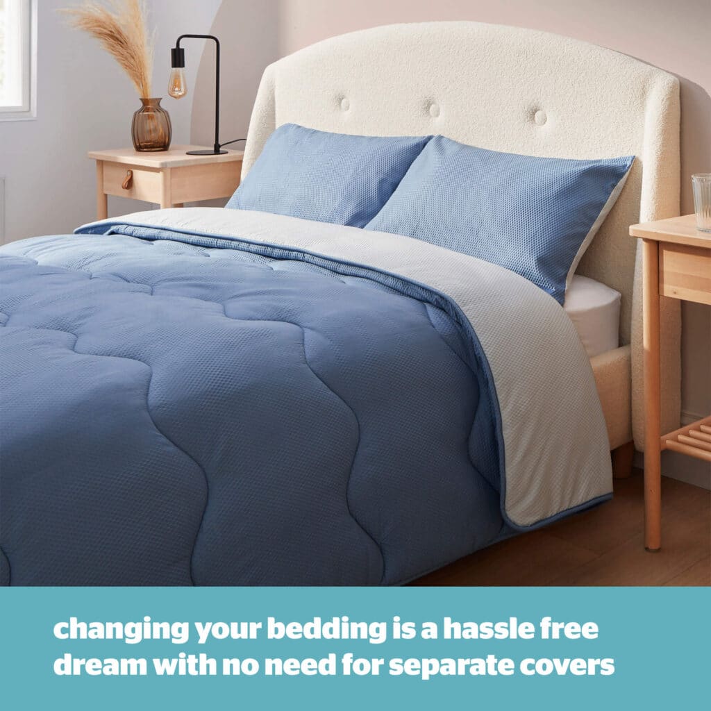 This bundle contains the Silentnight 2.5 Tog Coverless Duvet complete with a printed sewn on stylish seersucker cover and a matching pillowcase and 2 Silentnight Deep Sleep Pillows.