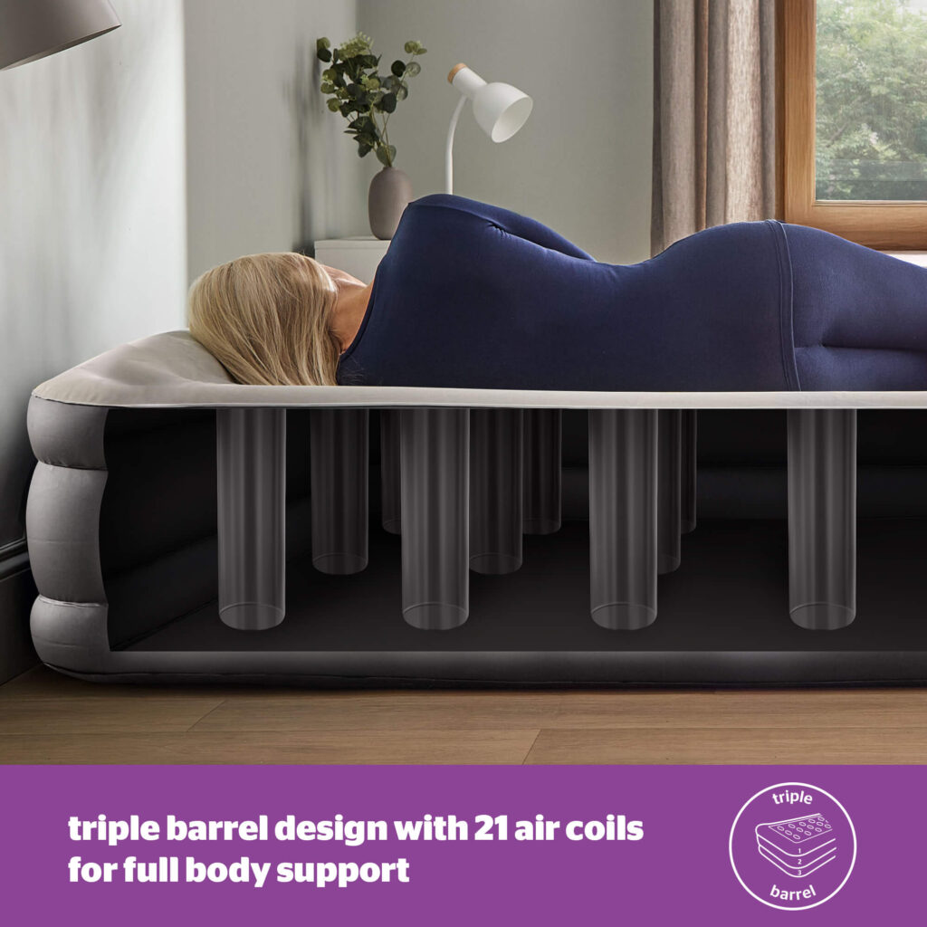 - COMFORTABLE SUPPORT: Triple barrel design with 21 air coils for full body alignment and deep, comforting support. Built-in raised pillow for head support
