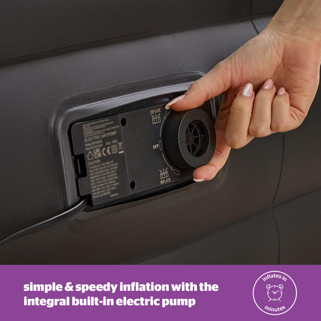 - FAST INFLATION: Simple and speedy inflation with the integral built-in electric pump. Repair patch included for punctures.