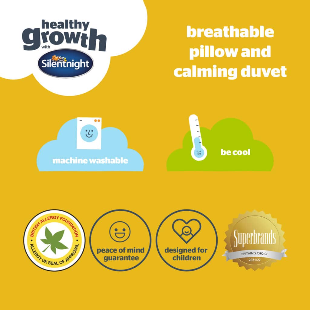 Paired with the Silentnight Healthy Growth Breathable Pillow that helps your child rest and recover in breathable comfort. The pillow features specially designed mesh sides which help to increase airflow.