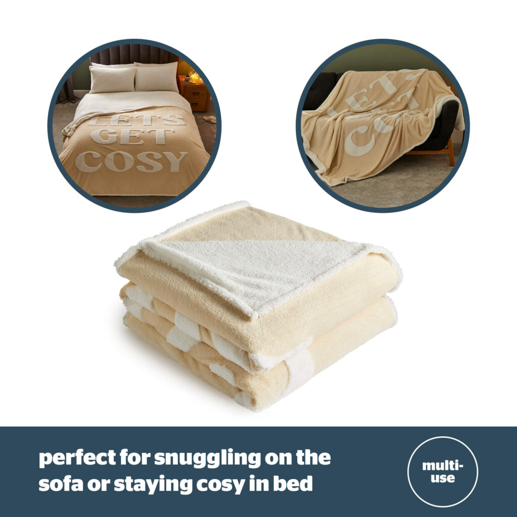 - GRAPHIC TEXT DESIGN: The design features the bold lettering “Let's Get Cosy” across the front of the blanket, perfect for winter.