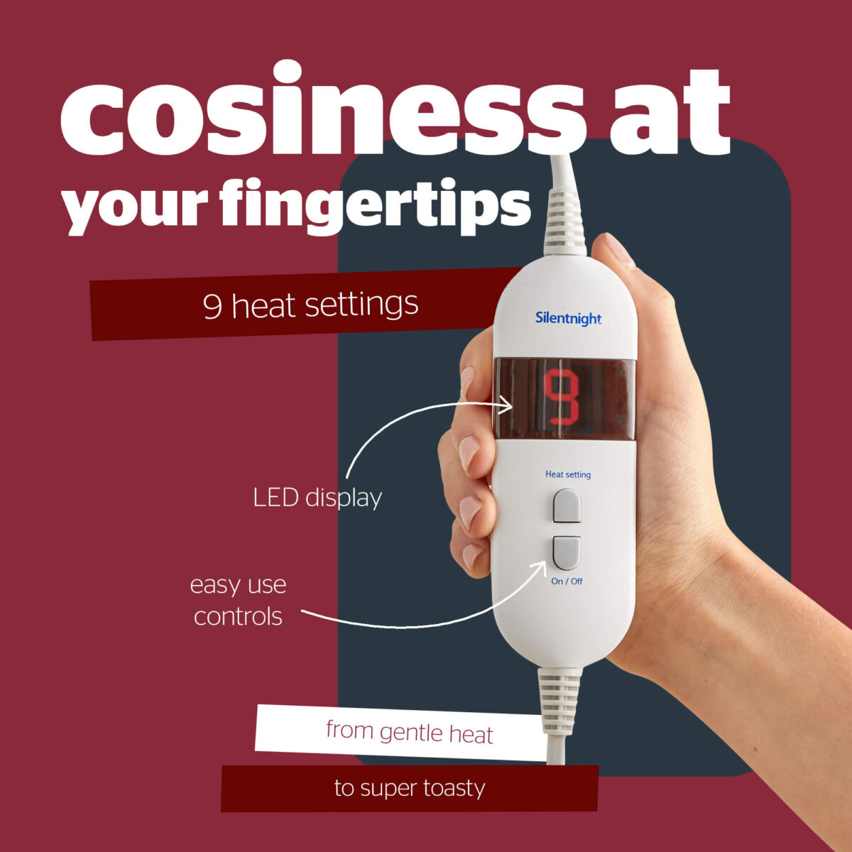 For the cosiest experience, please don’t fold or scrunch the blanket while it’s in use, as this may create hot spots and switch on the safety protection. Please ensure the controller is not covered or placed near other heat sources, such as a hot water bottle.