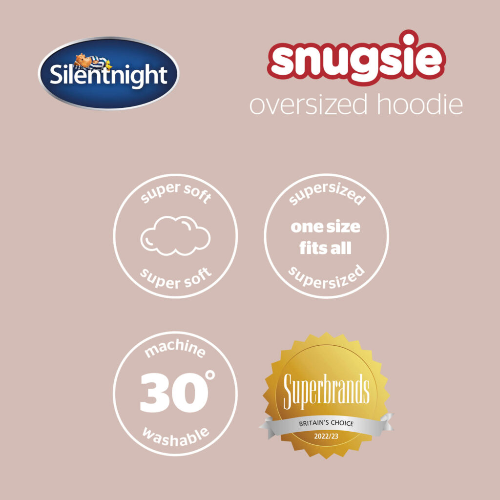 The Silentnight Snugsie Oversized Hoodie is the ultimate snuggly companion. Sumptuously soft, cuddly comfort to keep you warm and cosy as you relax. Perfect for snuggling on the sofa, working from home or entertaining friends in the garden, this snuggly companion works for every occasion!