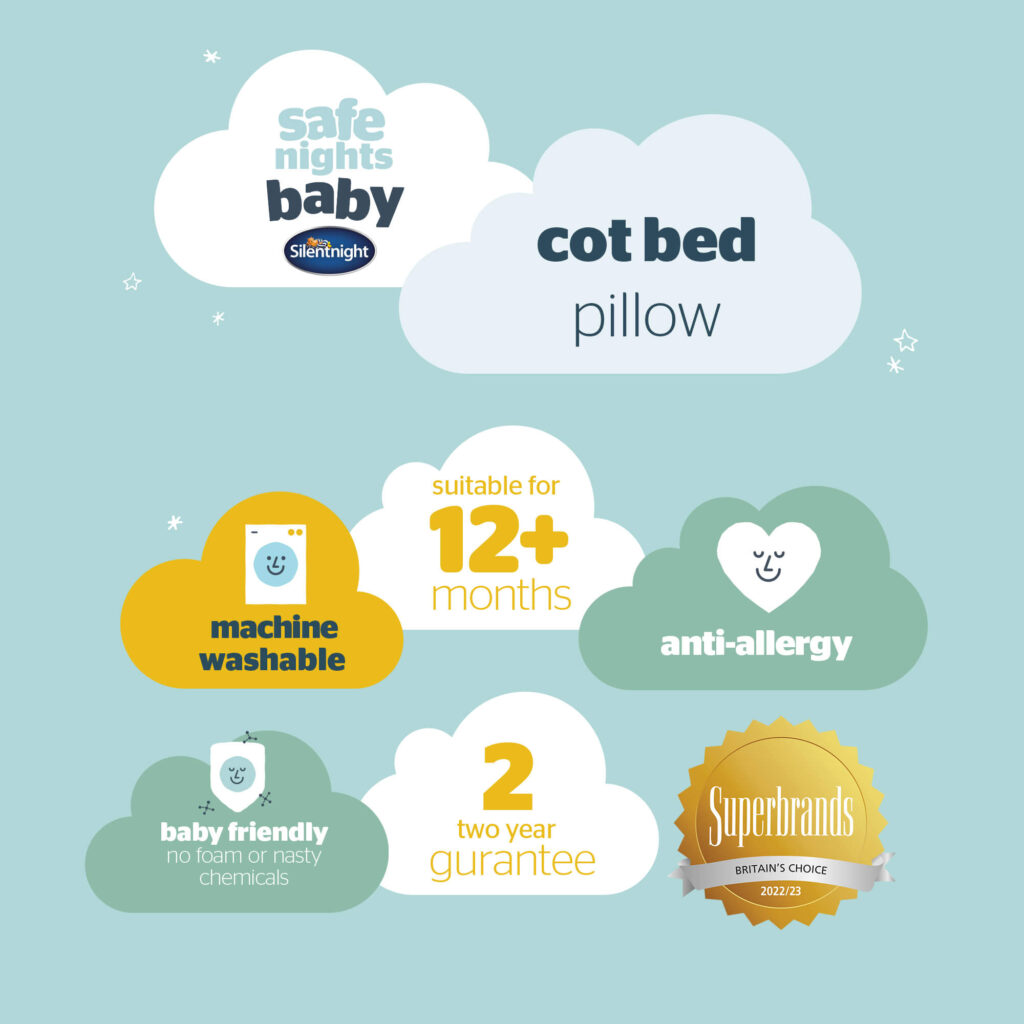 The Safe Nights Anti-allergy Cot Bed Pillow by Silentnight is soft and slim and has been uniquely designed with your little one’s comfort in mind. Little heads and necks need a different pillow height and support to adults, so we have designed this to be uniquely slim and softly supportive. Filled with anti-allergy fibres that keep bacteria at bay for a comfortable, hygienic sleep. Suitable for 12 months+.