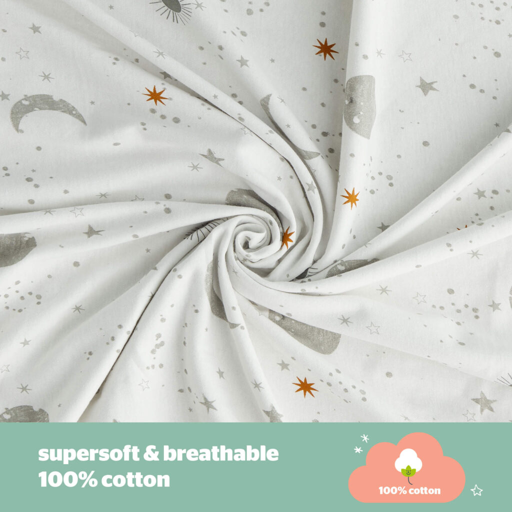Soft, cosy comfort for your little one. Once your baby is at least 12 months old, it’s perfectly safe to use a light tog duvet and a really soft pillow. Of course, that means you’ll need an equally soft and snuggly duvet cover and pillowcase. This lovely set is crafted in 100% jersey cotton which is naturally breathable and soft to the touch. The set features a duvet cover and one pillowcase to fit a standard cot bed duvet and pillow. In a stylish celestial design, combining soft neutrals, earthy sage, and calming greys.