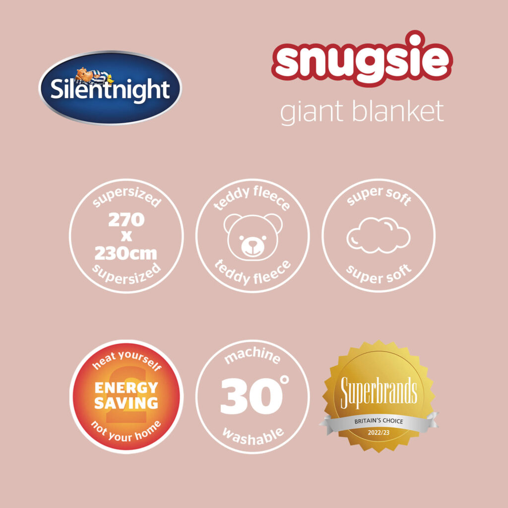The Silentnight Snugsie Super Giant Blanket is the ultimate snuggly accessory for your home. Sumptuously soft, cuddly comfort to keep you warm and cosy as you relax and big enough to fit the whole family. The blanket is extra super-sized for ultimate comfort, measuring 270 x 230cm – our biggest and cosiest blanket yet!