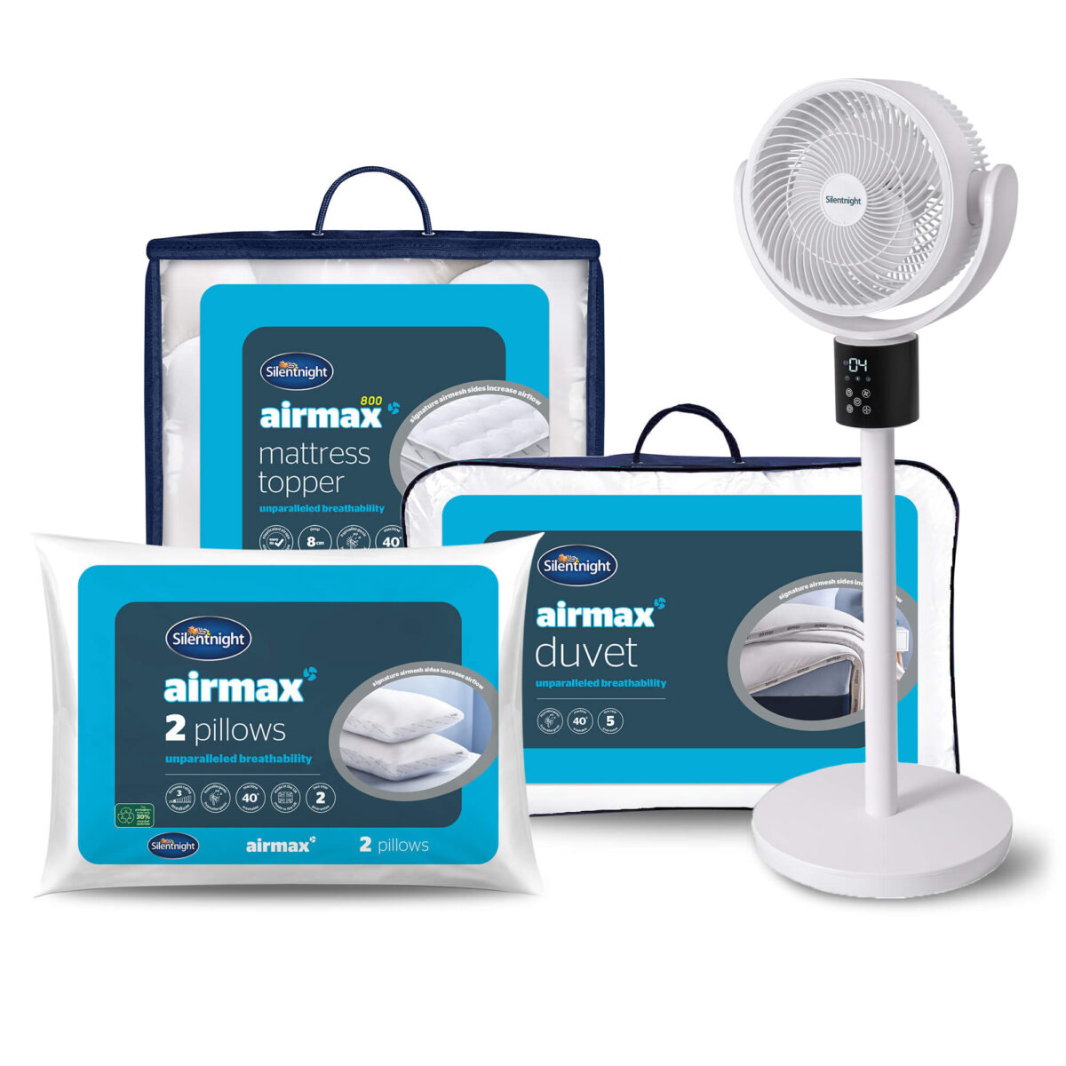 Experience unparalleled breathability with Airmax technology for a comfortably refreshing night’s sleep. This Summer Sleeper Bundle by Silentnight contains 1x Airmax Pro360 Fan, 1x Airmax 800 Topper, 2x Airmax Pillows and 1x Airmax 10.5 Tog Duvet.