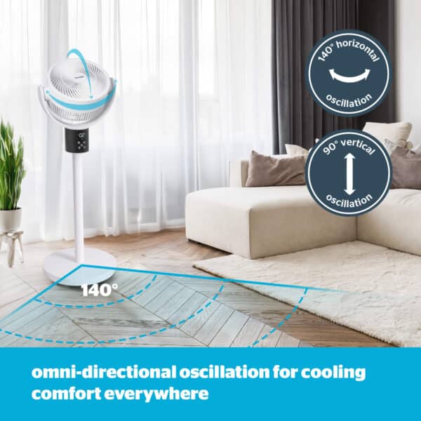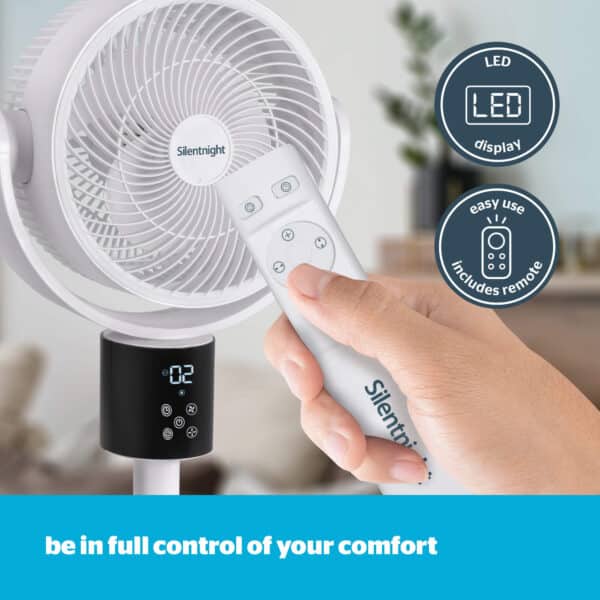 The Silentnight Airmax Pro360 Fan features 3 fan blades and 12 powerful speed settings, to keep you cool and comfortable. Our quietest yet most powerful fan, from just 30dbA, you can experience powerful cooling for an undisturbed and cool night’s sleep. Also featuring a 15hour timer for peace of mind. The omni-directional oscillation means you will feel cooling comfort everywhere. Turning in every direction, the 140° horizontal and 90° vertical oscillation boosts air circulation around the entire room. This fan can be easily moved from room to room and also features 2 adjustable heights, for the best position and location. Featuring an easy-to-use remote control and digital LED display, for ultimate convenience and control.