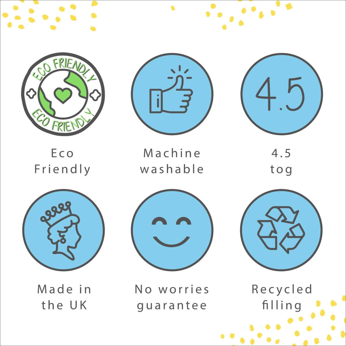 We’ve got you; your bedding is made from recycled materials giving our lovely planet a helping hand. We care so you can be carefree, the squidgy fibres were once plastic bottles that have experienced a wonderful makeover. Our packaging is specially made from sugarcane plants; this sustainable material is carbon negative and can be fully recycled.