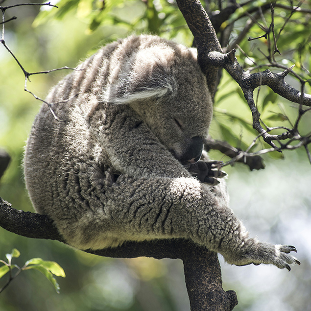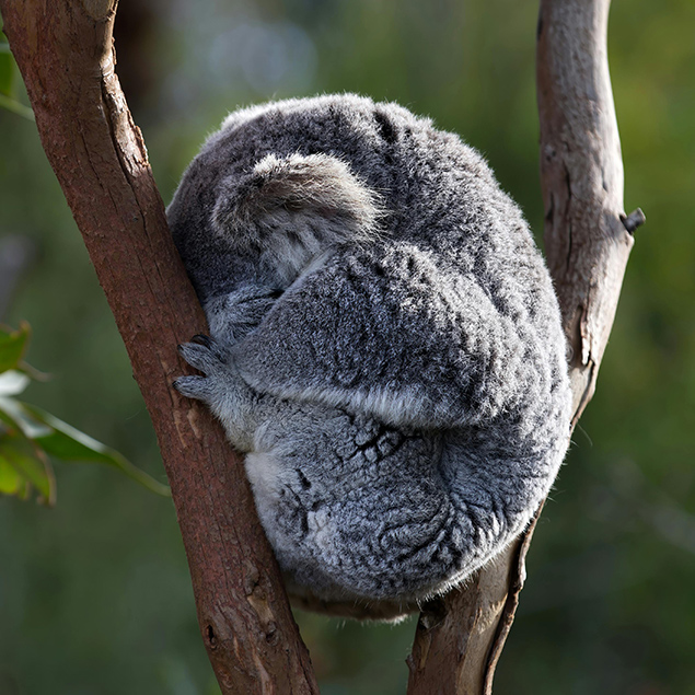 Koalas are thickset arboreal marsupials with a thick grey fur. Found only living in Australia, they mainly live in the eucalyptus trees and spend around 22 hours of their time sleeping (90%). They spend the other 10% of their day eating and sitting around.
