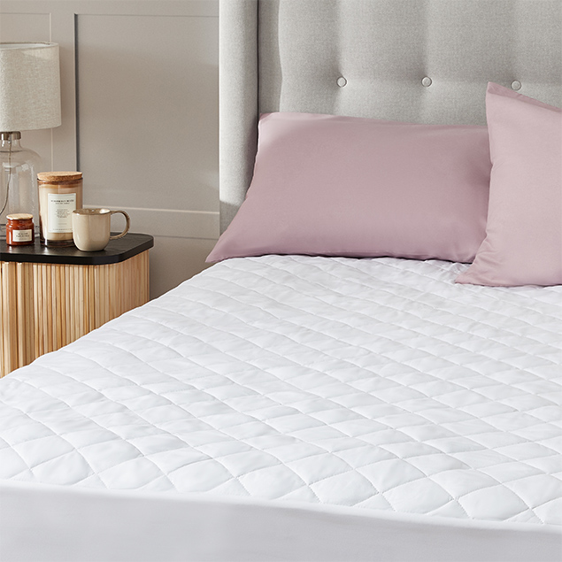 A mattress protector is a practical bedding essential. It is placed over your mattress and under your fitted sheet, acting as a shield to protect your mattress. Fitting it to your mattress is easy, as some come with fitted skirts that cover the top and all sides of your mattress, while others include straps that fit snugly to your mattress corners.